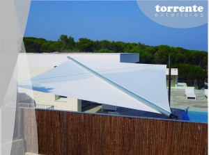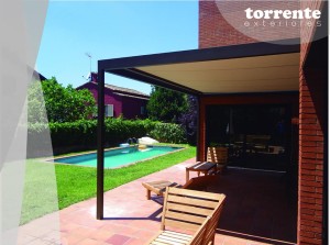 Pèrgola anti-pluja amb tendal corredís d’ones sistema tensió. Accionat amb motor amb sistema de tensionat del teixit. Sortida màxima de 8.00 m. sense pals intermedis.
